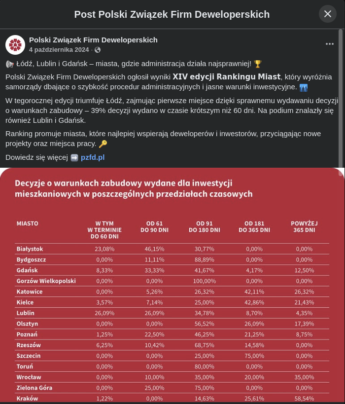 And in Łódź? Łódź is a real paradise for developers, confirmed by the developers themselves, but unfortunately a hell for the lungs. And the words about a “paradise for developers” are not just journalistic exaggeration. It’s hard data. According to the ranking of the Polish Association of Development Companies, Łódź is the most developer-friendly city in all of Poland. As much as 38.85% of decisions on development conditions are issued there in less than 60 days! For comparison, in Warsaw it is only 1.20%, and in Krakow 1.22%. A big difference, but Łódź likes green development…